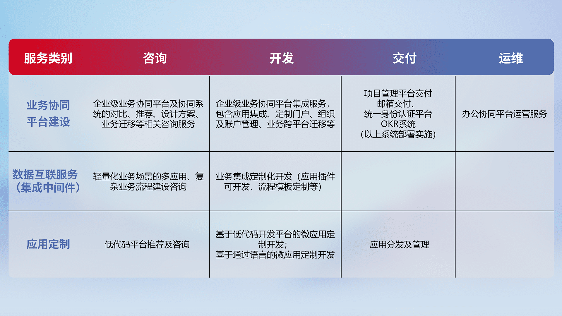 针对钉钉、、企微、、、、IDaas等平台级产品提供产品的规划、、、方案、、交付、、、定制化开发等服务,,,实现如统一协同办公、、、、智能客户服务、、混合会议管理、、、智能数据查询、、、等业务场景,,,,实现数字化转型。。。。